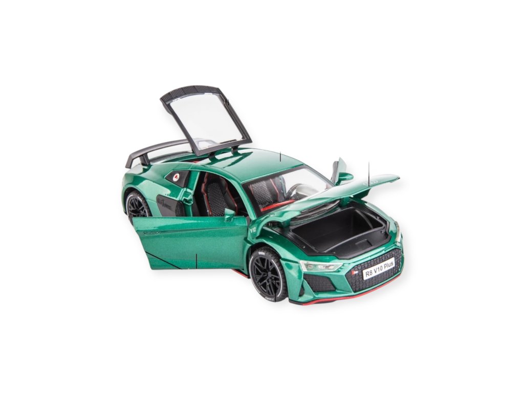Toto detailne spracované kovové auto v mierke 1:24 verne kopíruje ikonický Audi R8 V10. Má kvalitné celokovové telo, otváracie dvere a realistické spracovanie interiéru aj exteriéru. Po stlačení tlačidiel sa aktivujú svetelné a zvukové efekty – štart motora, klaksón a predné svetlá, ktoré dodajú autíčku ešte väčšiu autentickosť.